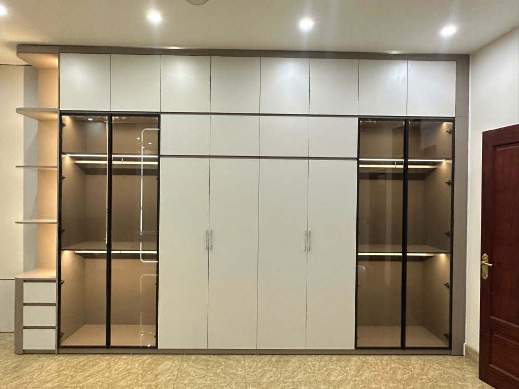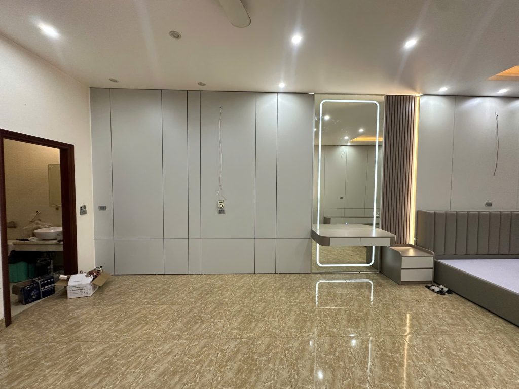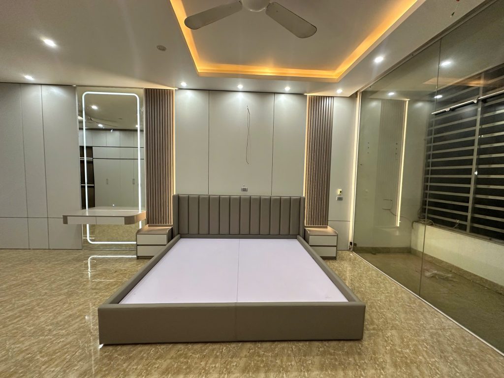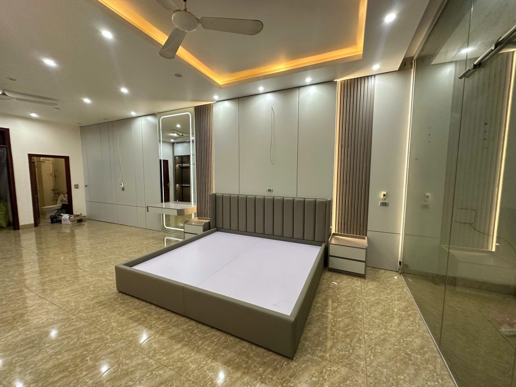 Bên trong chứa khung xương gỗ MDF, bên ngoài phủ lớp MDF chống ẩm. Hoàn thiện theo thiết kế.